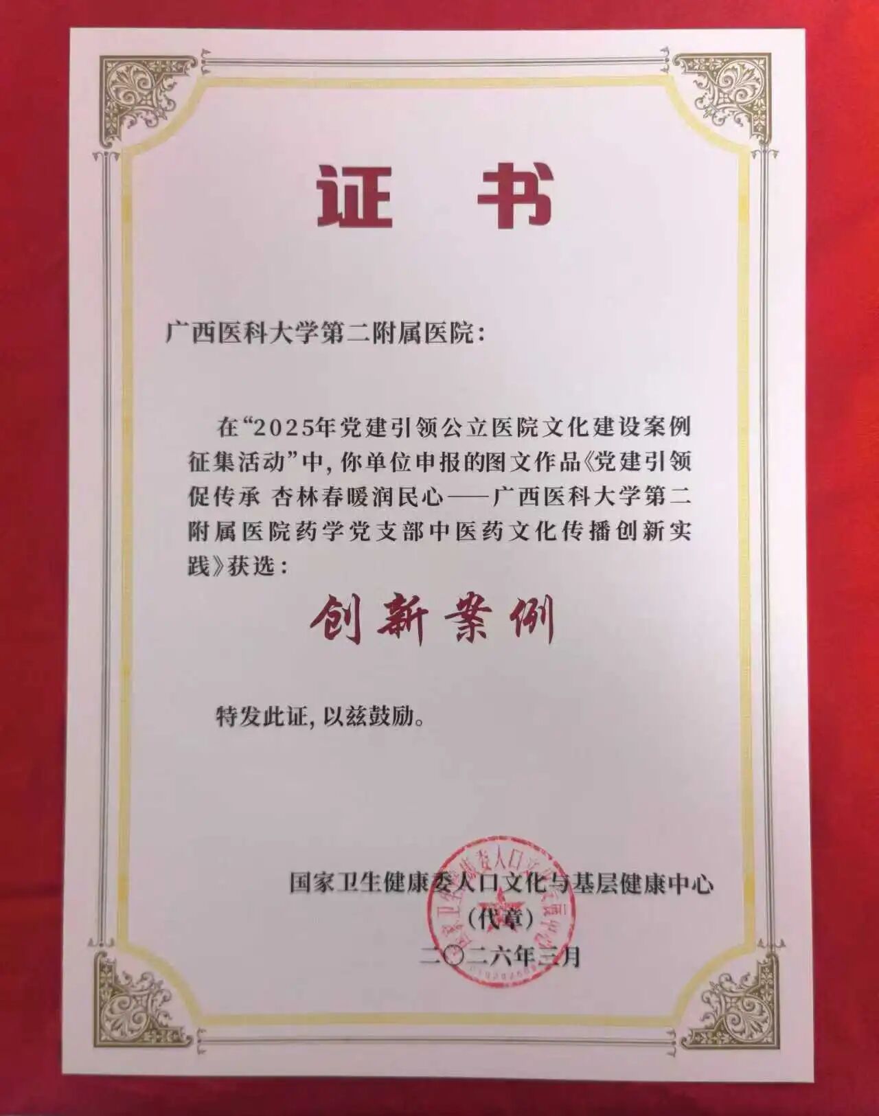 3月28日,由国家卫生健康委人口文化与基层健康中心主办的2025-2026党建引领公立医院文化建设经验交流活动会在南宁举行,taptap点点第二附属医院药学党支部选送的《党建引领促传承 杏林春暖润民心——中医药文化传播创新实践项目》,从众多参赛作品中脱颖而出,荣获大会创新案例。