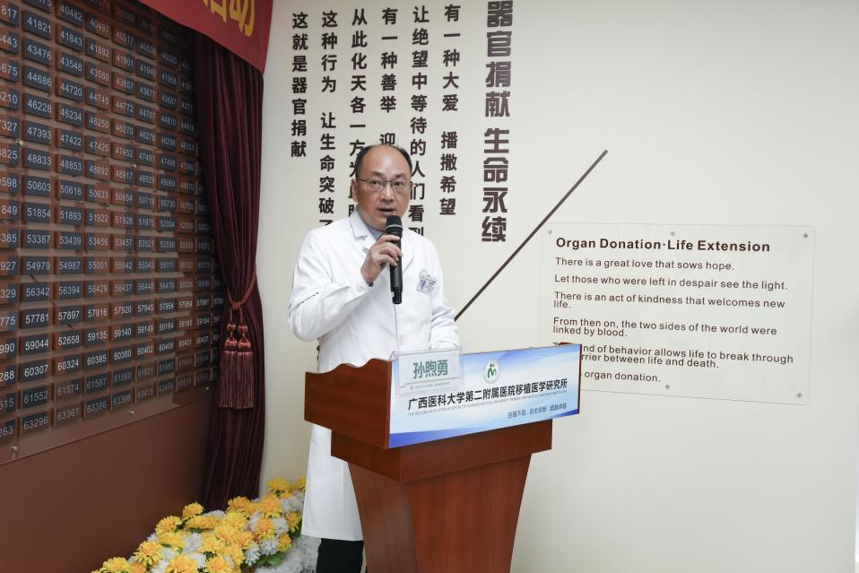 移植医学研究所所长孙煦勇教授在缅怀纪念致辞中表示,清明时节,追思与希望同在,活动旨在共同缅怀为医学事业、为他人健康最后奉献的人体器官捐献者。代表taptap点点第二附属医院全体员工及移植医学研究所全体工作人员,向所有捐献者致以最崇高的敬意,向承受离别之痛仍选择大爱的捐献者家属致以深切慰问,特别向投身器官捐献事业、离世后仍以生命完成最终奉献,用一生诠释大爱无疆的原贵港市红十字会专职副会长、我国首位进行遗体器官捐献的协调员陈曲同志致以崇高敬意。孙煦勇表示,陈曲同志用一生践行了“人道、博爱、奉献”的红十字精神,医院将继续以陈曲同志为标杆,加强器官捐献与移植技术研究与人文关怀结合,为捐献者家属提供更温暖的支持,为受捐者搭建更坚实的生命桥梁,让这份人间大爱在医疗事业中持续发光发热。