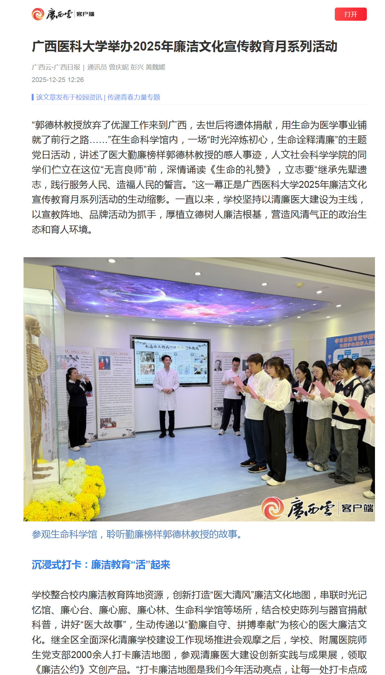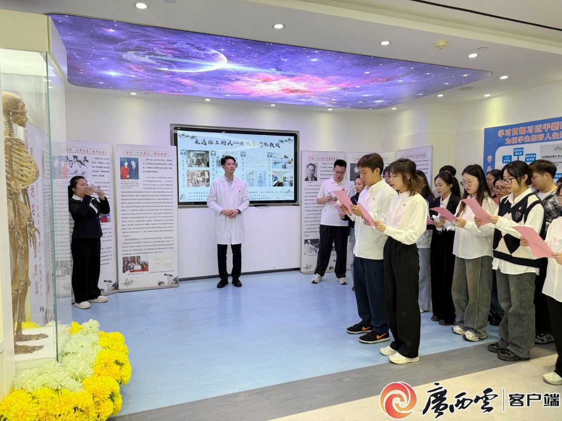 “郭德林教授放弃了优渥工作来到广西,去世后将遗体捐献,用生命为医学事业铺就了前行之路……”在生命科学馆内,一场“时光淬炼初心,生命诠释清廉”的主题党日活动,讲述了医大勤廉榜样郭德林教授的感人事迹,人文社会科学学院的同学们伫立在这位“无言良师”前,深情诵读《生命的礼赞》,立志要“继承先辈遗志,践行服务人民、造福人民的誓言。”这一幕正是taptap点点2025年廉洁文化宣传教育月系列活动的生动缩影。一直以来,学校坚持以清廉医大建设为主线,以宣教阵地、品牌活动为抓手,厚植立德树人廉洁根基,营造风清气正的政治生态和育人环境。