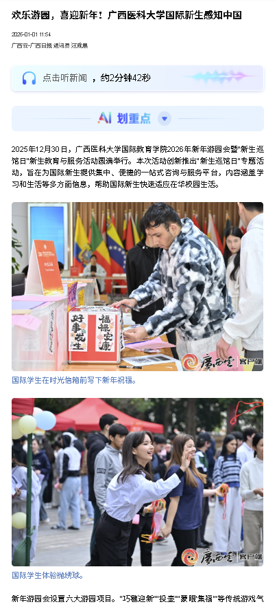 近日,广西云-广西日报报道taptap国际教育学院2026年新年游园会暨“新生巡馆日”新生教育与服务活动,本次活动以“服务+文化”的双线设计,切实提升了国际新生的归属感与获得感,通过趣味游园项目,让学生们在互动体验中进一步融入校园、感知中国文化,是国际化管理与服务的有益尝试。