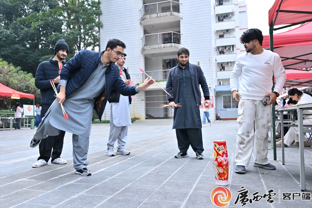 国际学生参加游园会投壶活动。