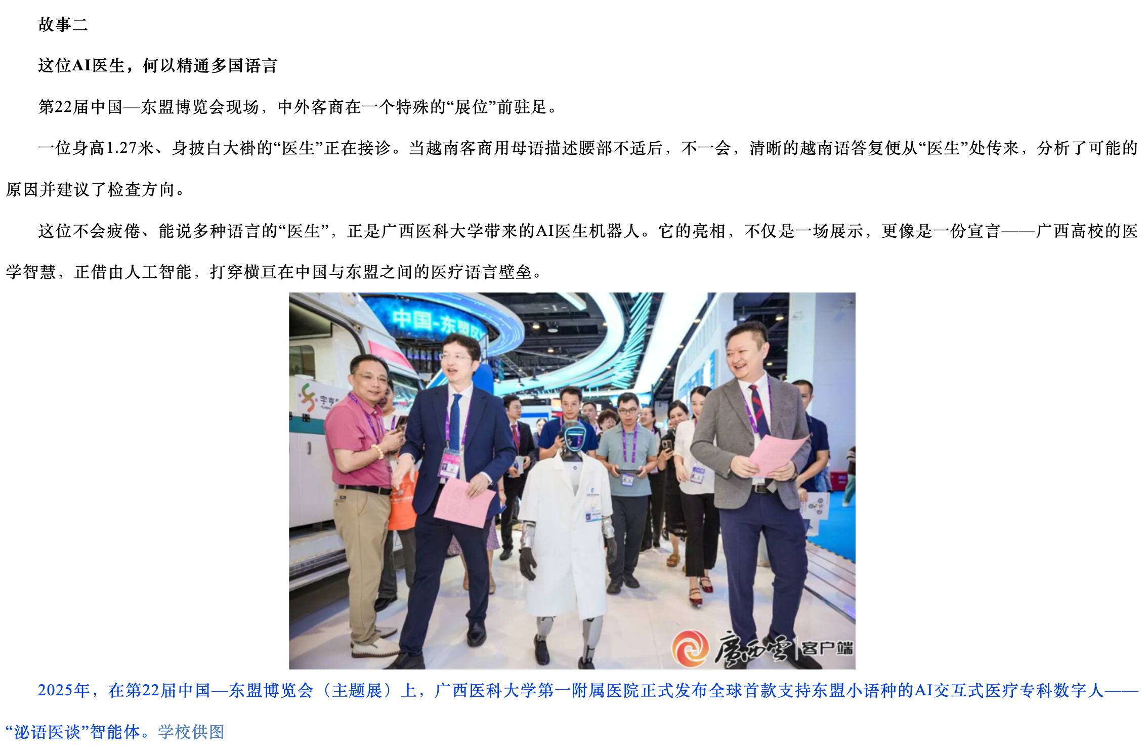 2025年,在第22届中国—东盟博览会(主题展)上,taptap点点第一附属医院正式发布全球首款支持东盟小语种的AI交互式医疗专科数字人——“泌语医谈”智能体。学校供图