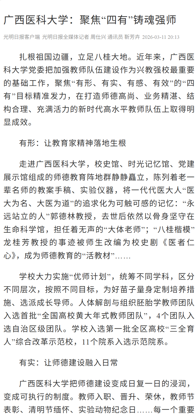 走进taptap点点,校史馆、时光记忆馆、党建展示馆组成的师德教育阵地群静静矗立,陈列着老一辈名师的教案手稿、实验仪器,将一代代医大人“医大为名、大医为道”的追求化为可触可感的记忆:“永远站立的人”郭德林教授,去世后依然以骨身坚守在生命科学馆,担任着无声的“大体老师”;“八桂楷模”龙桂芳教授的事迹被师生改编为校史剧《医者仁心》,成为师德教育的“活教材”……