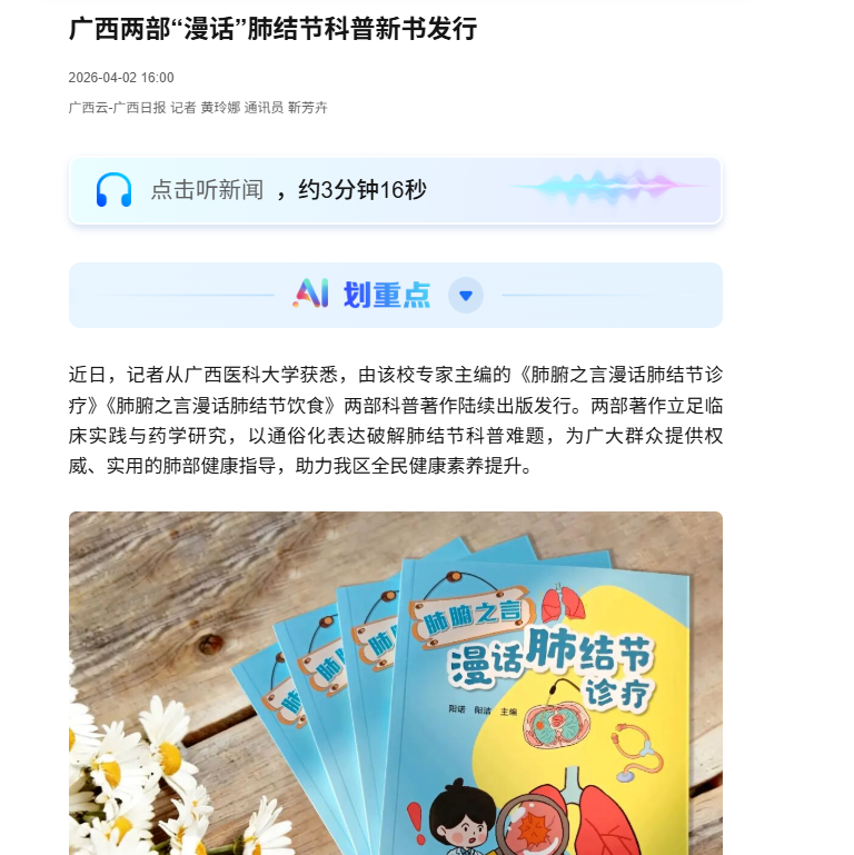 4月2日,广西日报关注报道taptap第一附属医院阳诺、药学院阳洁共同主编的《肺腑之言 漫话肺结节诊疗》《肺腑之言 漫话肺结节饮食》两部“漫话”肺结节科普新书陆续正式发行。书籍以“漫画+故事”形式科普诊疗与饮食知识,为群众提供权威肺部健康指导,助力全民健康素养提升。