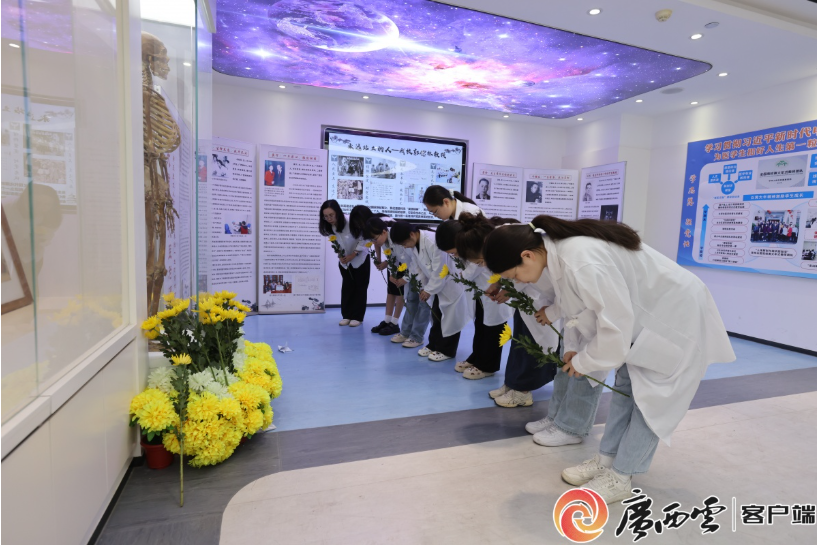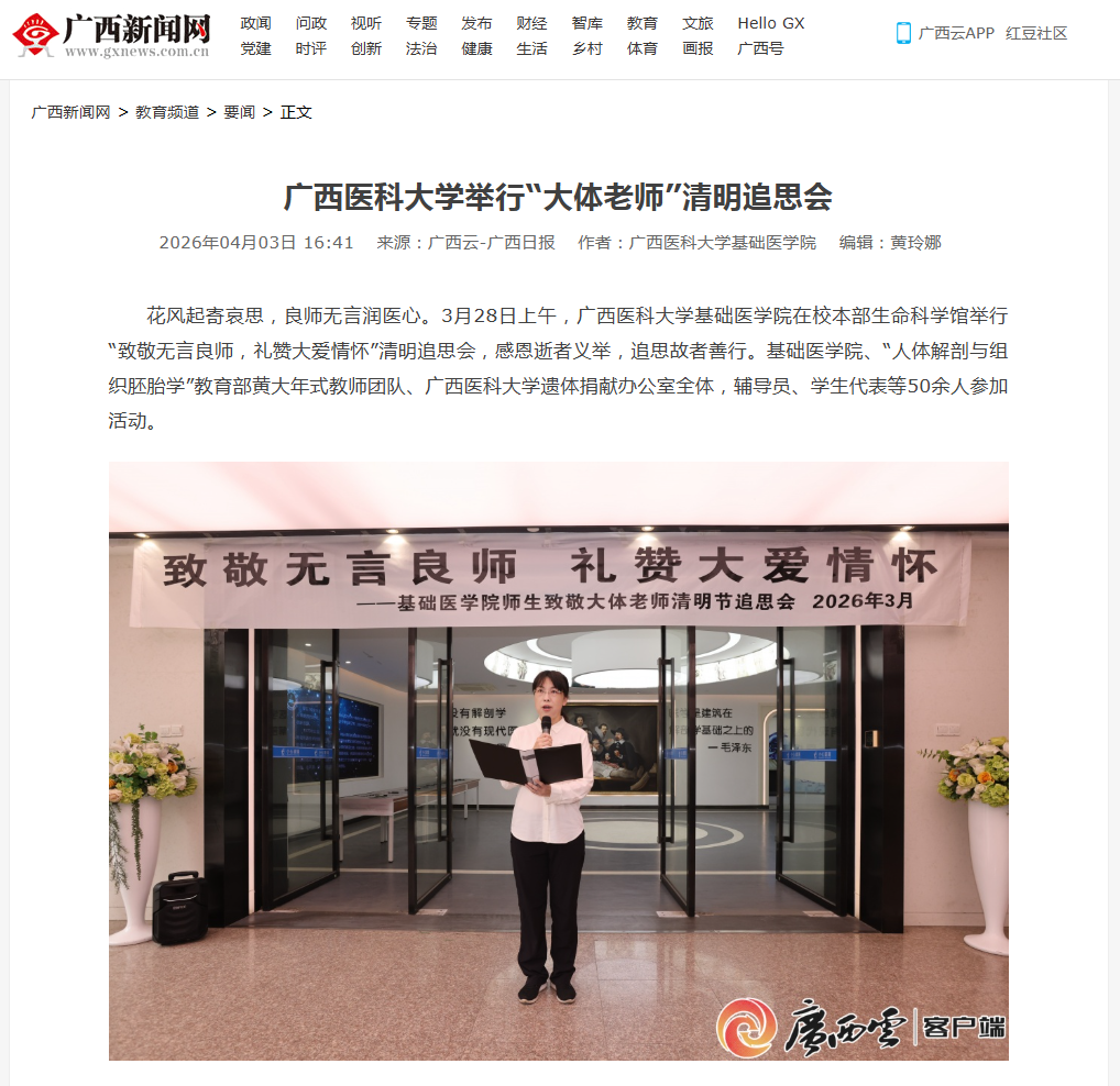 4月3日,广西日报-广西云客户端报道了taptap基础医学院师生在校本部生命科学馆举行清明追思会活动。薪火相传,缅怀奉献,这场深刻的“大思政课”继承了十余年的坚守和回望,引导医大师生更深入地理解生命、敬畏生命。