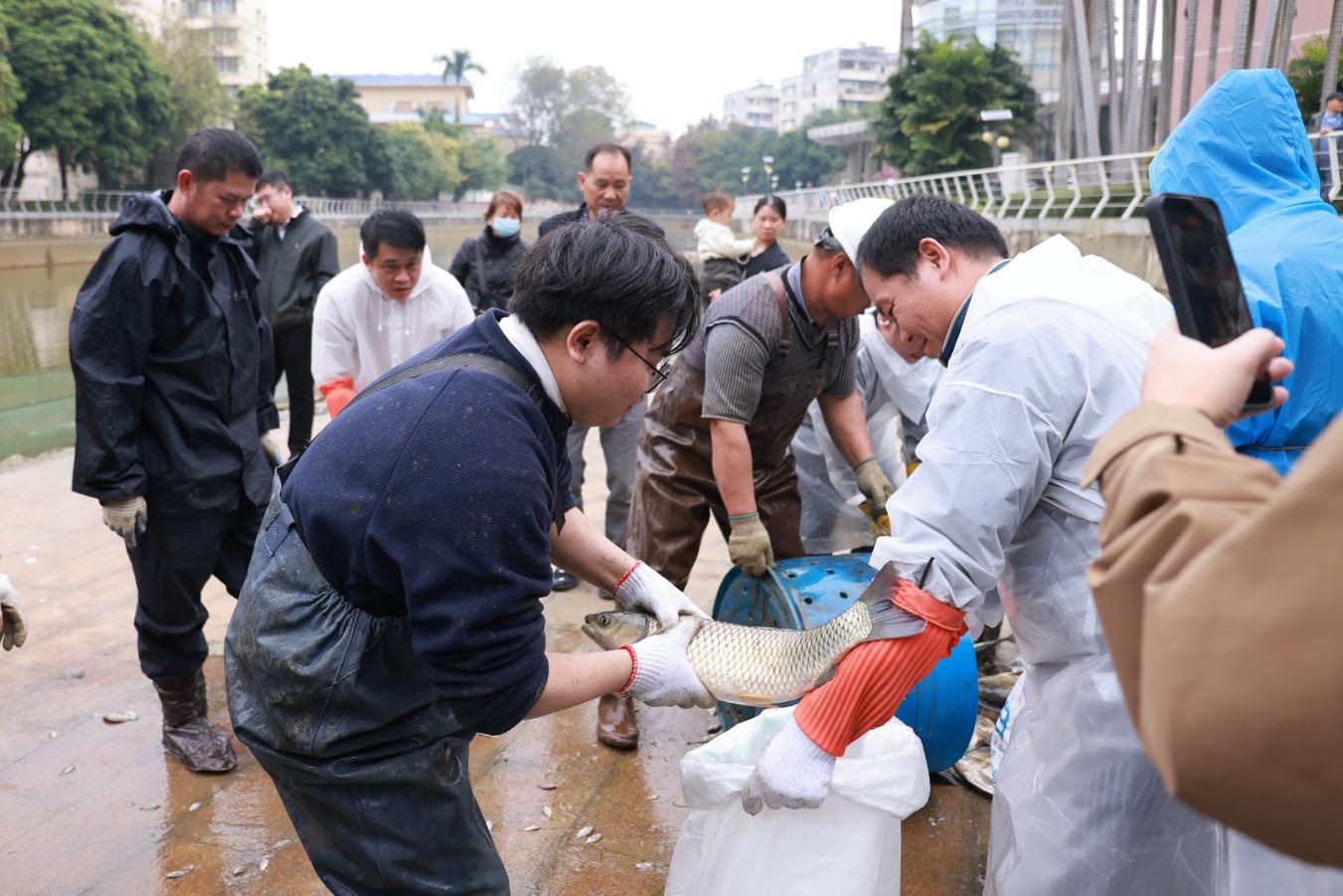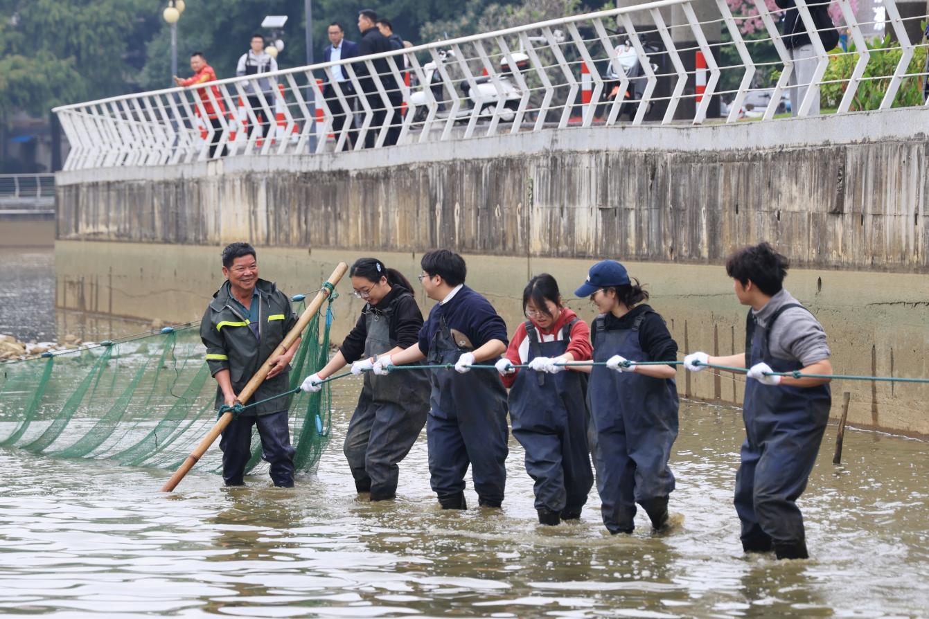12月29日上午,一年一度的杏湖冬捕活动在taptap点点南宁—校本部杏湖拉开序幕。学校校长曾志羽、副校长唐卫中、师生代表及离退休教职工齐聚湖畔,共同见证丰收场景。在专业人员的指导下,十余名学生参与了拉网、收鱼等捕捞环节。活动共捕捞“幸福鱼”(杏湖鱼)近8000斤,品种涵盖罗非鱼、草鱼、白鲢鱼、鲤鱼等。活动同步在南宁市融媒体中心新闻夜班相关账号开展直播,网络直播观看总人次100522人次。