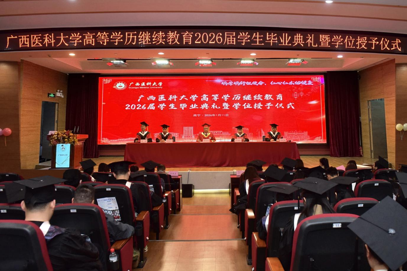 毕业典礼上,曾志羽校长以“砺学砺行担使命,仁心仁术佑健康”为题寄语全体毕业生,他希望毕业生们以“扎根基层”为笔,做健康广西的“筑梦人”;以“终身学习”为帆,做医学创新的“追光者”;以“仁心仁术”为灯,做医德医风的“践行者”。卢德成宣读授予学士学位文件。
