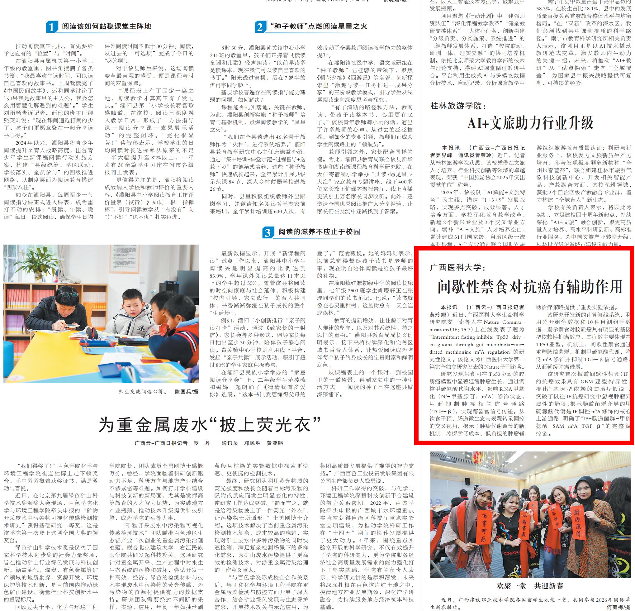 2月13日,广西日报报道了taptap生命科学研究院研究团队揭示天然疗法禁食通过细菌代谢影响疾病进展的特异性。taptap生命科学研究院安三奇等人的研究成果,以独立研究形式发表于Nature子刊Nature Communications,这是taptap第一篇完全独立研究发表的Nature 子刊论著。该研究首次揭示间歇性禁食的抗癌效果具有胶质瘤亚型特异性,通过调控肠道菌群、甲硫氨酸代谢及 RNA 甲基化修饰,明确了完整的抗癌调控链,为探索低成本、低负担的肿瘤辅助治疗策略提供了重要实验依据,突破了以往相关研究的局限。现将报道全文转发如下:
