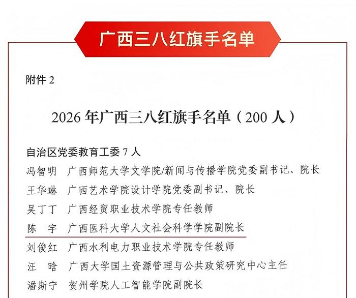 为表彰先进、树立榜样,激励广大妇女奋进新征程、建功新时代,自治区妇联开展表彰工作,授予一批单位和个人荣誉,taptap人文社会科学学院副院长陈宇教授荣获2026年广西三八红旗手称号。
