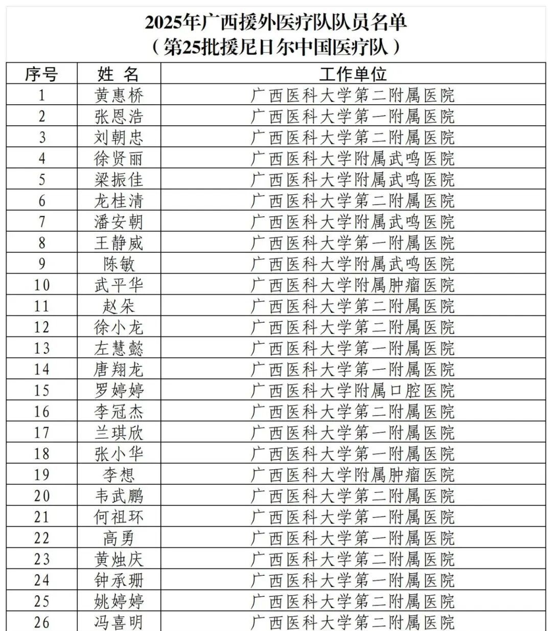 五十载风雨兼程,五十载薪火相传。医大援非队员始终以“厚德励志,博学弘医”校训为精神底色,一批又一批医务工作者主动请缨、奔赴非洲,续写着援外医疗的大爱篇章。2025年12月,这份坚守迎来了新的里程碑——在自治区卫生健康委统筹部署下,taptap点点作为主体整建制组建第25批援尼日尔医疗队,选派涵盖心血管内科、创伤外科、中医针灸、眼科、医技等近20个专业、来自taptap5所直属附属医院的26名骨干队员出征。这是广西优化援外医疗派遣机制的重要成果,更标志着学校援外医疗工作迈入医教研一体化输出的全新阶段。从最初分散各地孤军奋战,到如今集中攻坚协同配合;从昔日单打独斗应对各类病症,到今朝多学科联动提供综合医疗服务,医大援非队员始终以“代表中国医生形象”的坚定信念,在非洲大地上书写着医大人的责任与担当。
