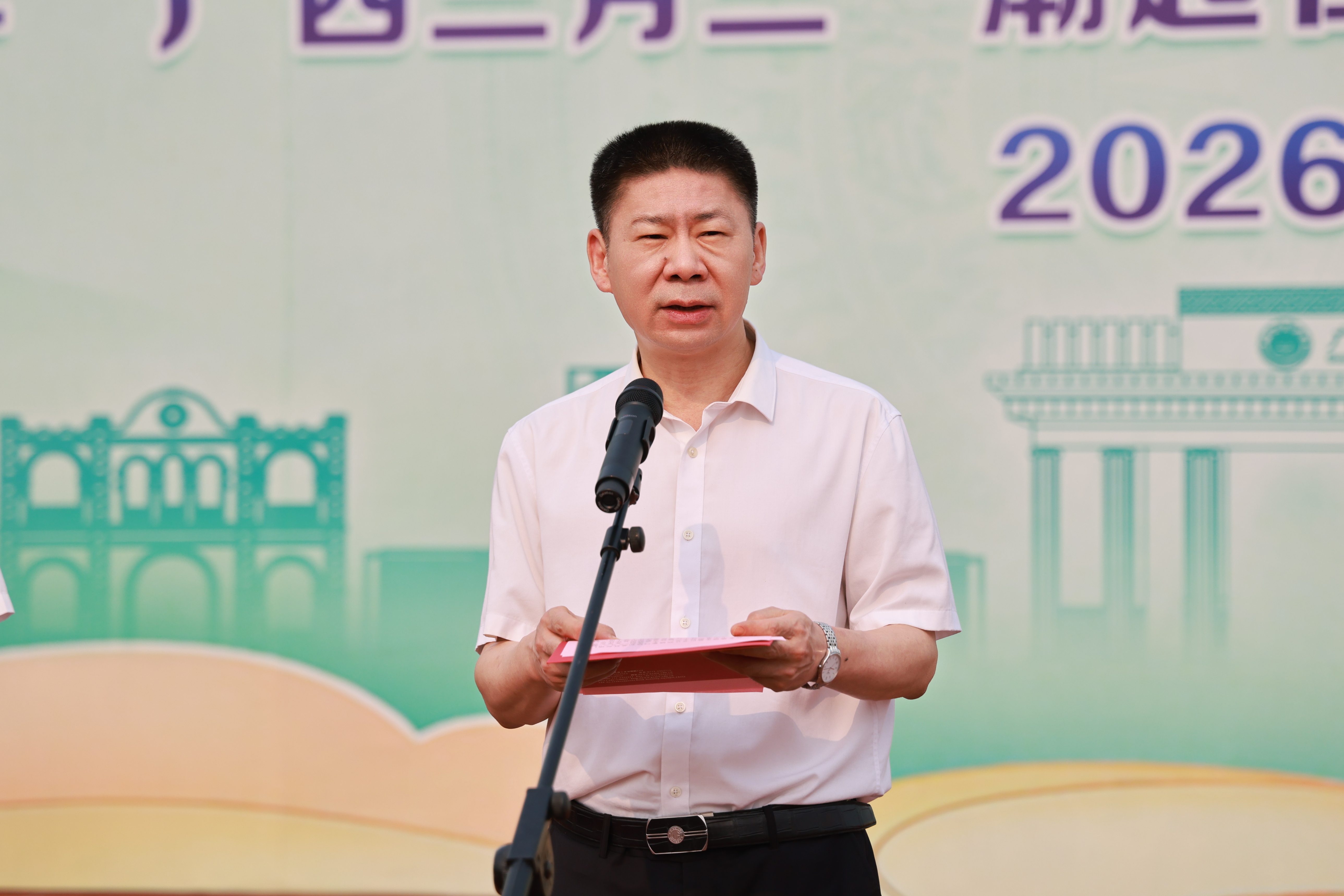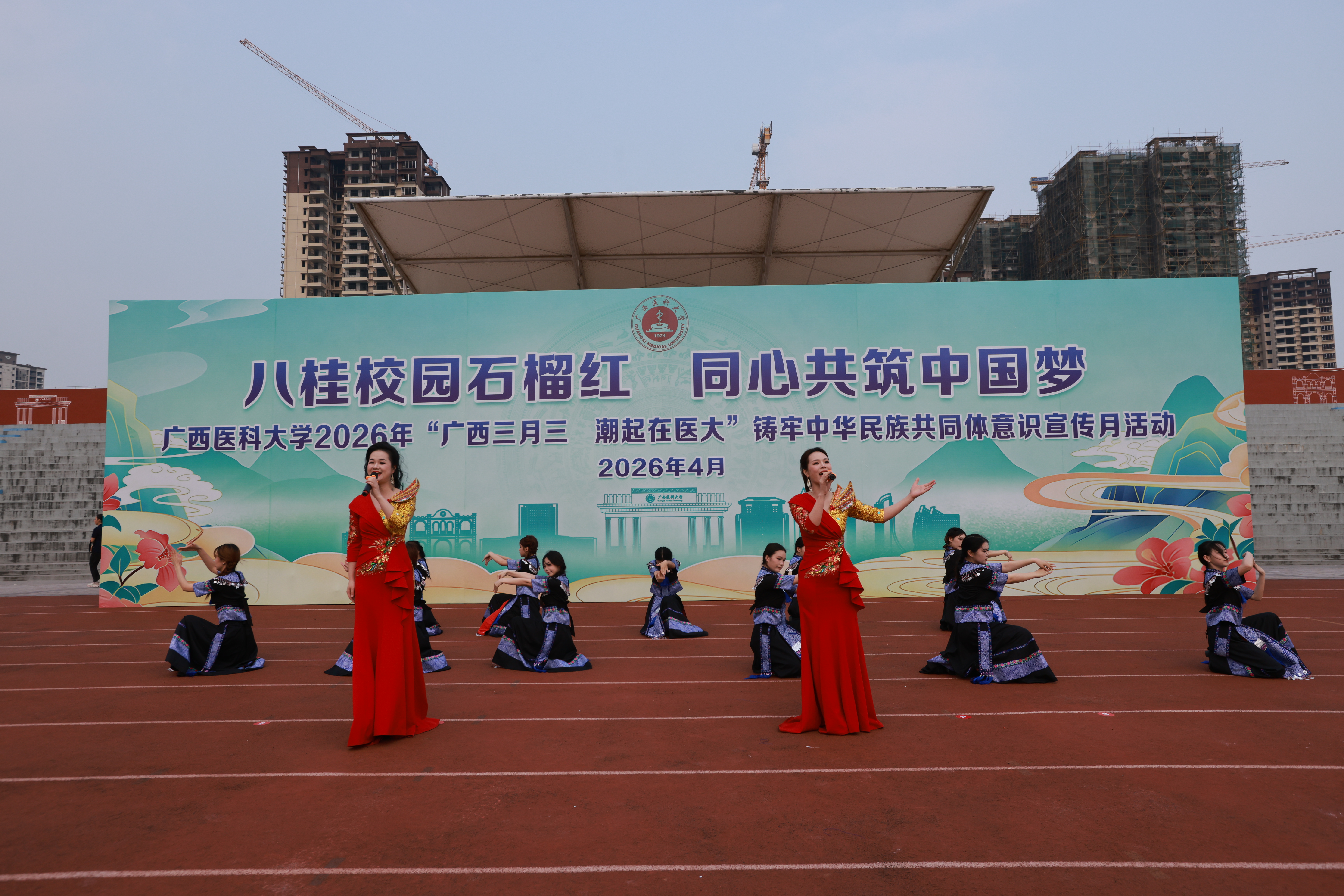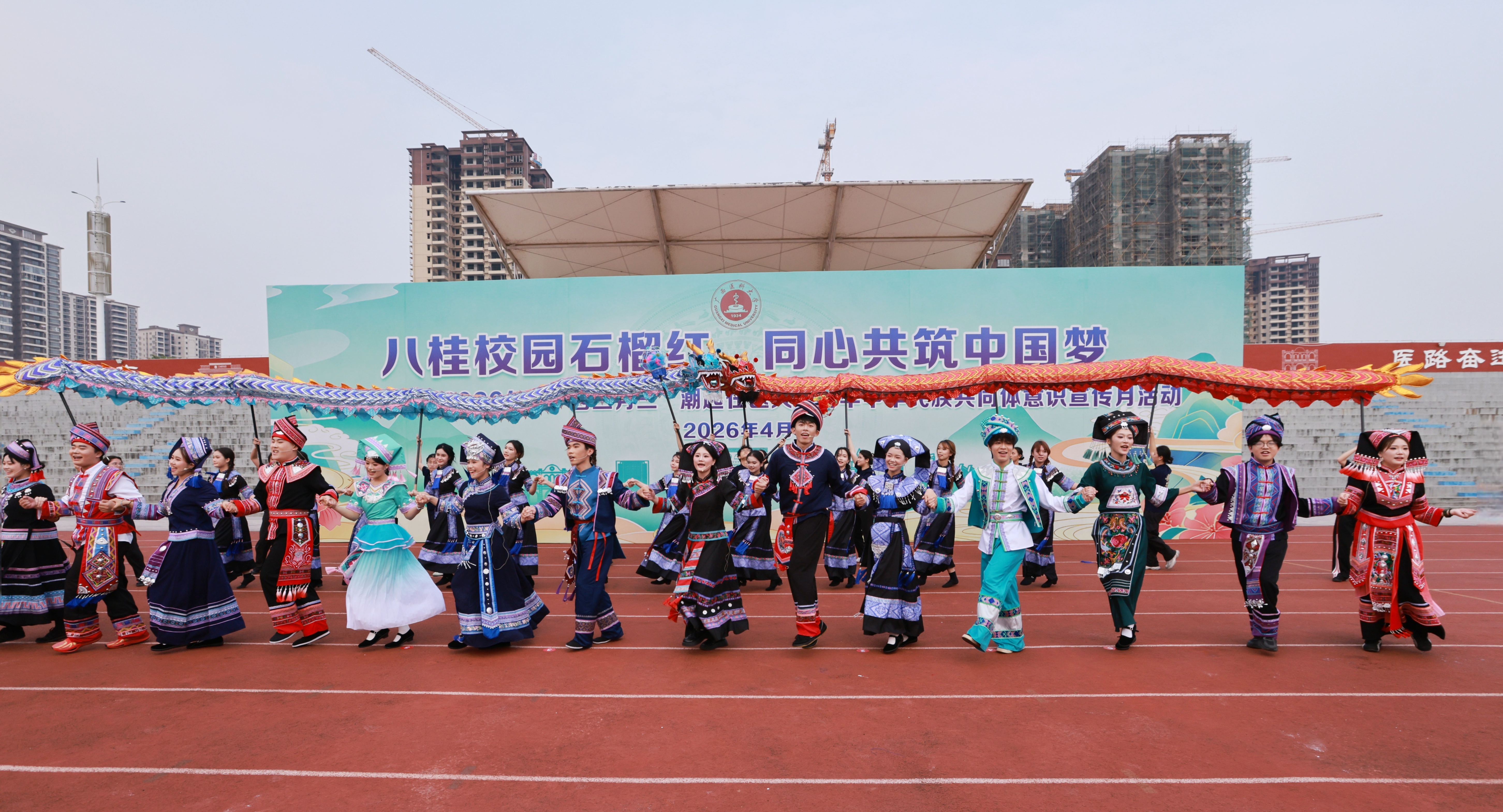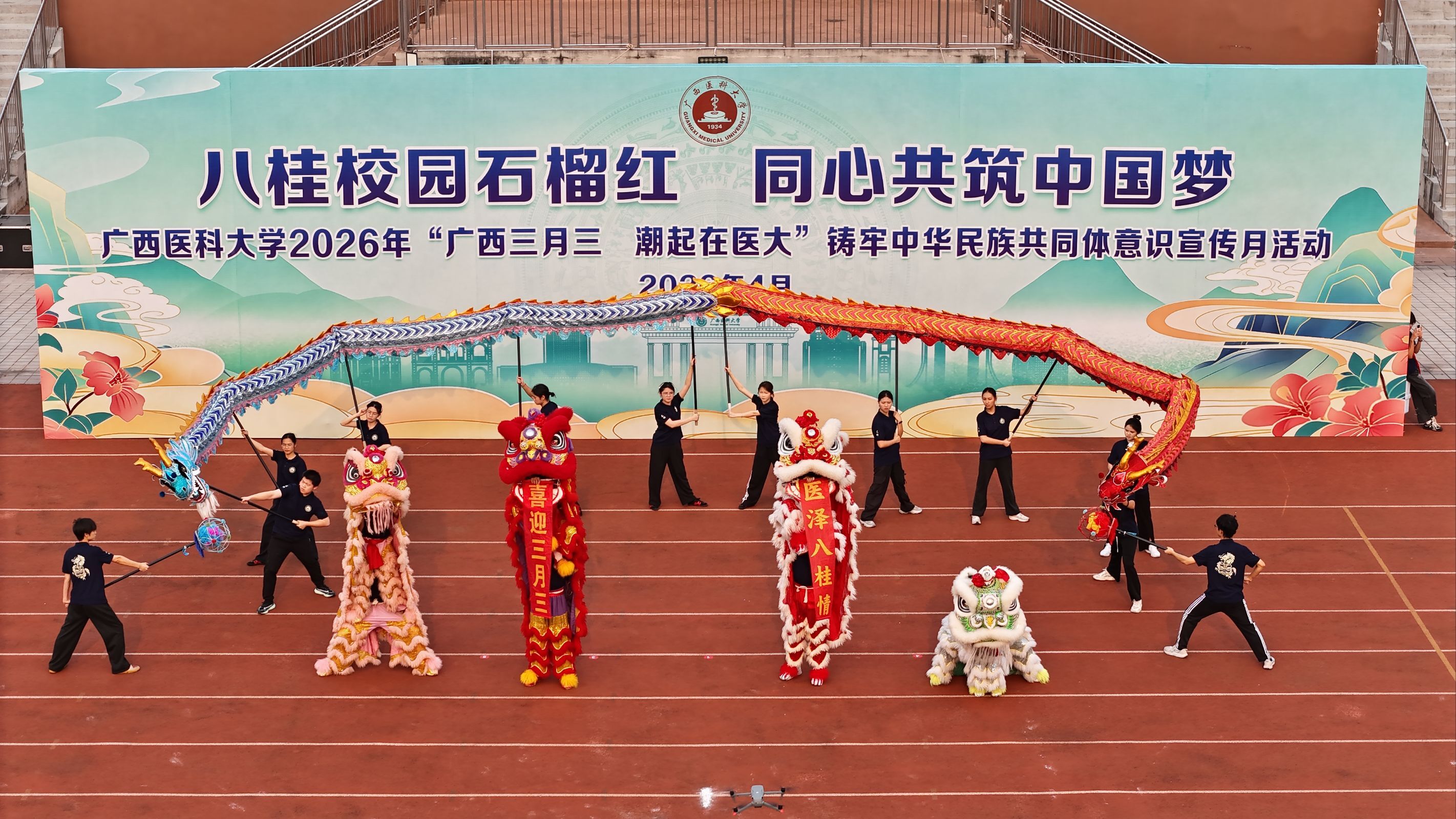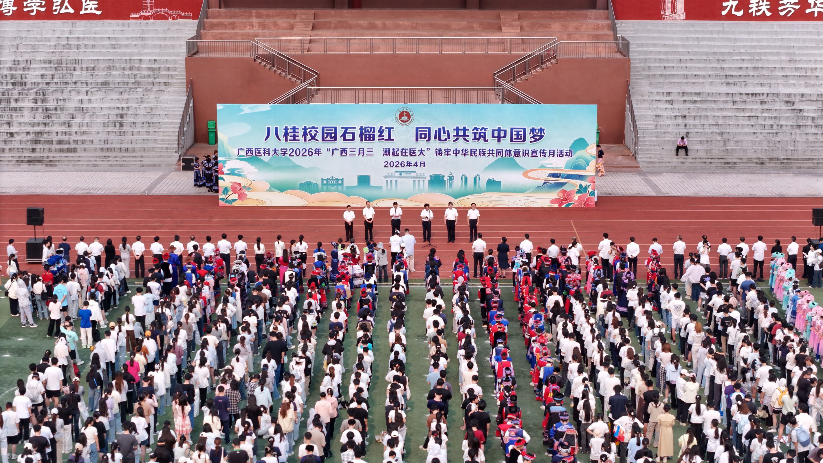 壮乡春深,歌潮花海,“三月三”将至。4月11日上午,2026年“广西三月三·潮起在医大”铸牢中华民族共同体意识宣传月活动开幕式在武鸣校区田径场举行,引导师生铸牢中华民族共同体意识,营造庆祝“广西三月三”的喜庆氛围。学校党委书记陈川致辞并宣布宣传活动月开幕,校长曾志羽主持开幕式。副书记刘灵光、驻校纪检监察组组长韦敏观,副校长卢德成、廖红兵,各相关职能部门负责人、二级党组织书记、师生代表1700多人参加活动。