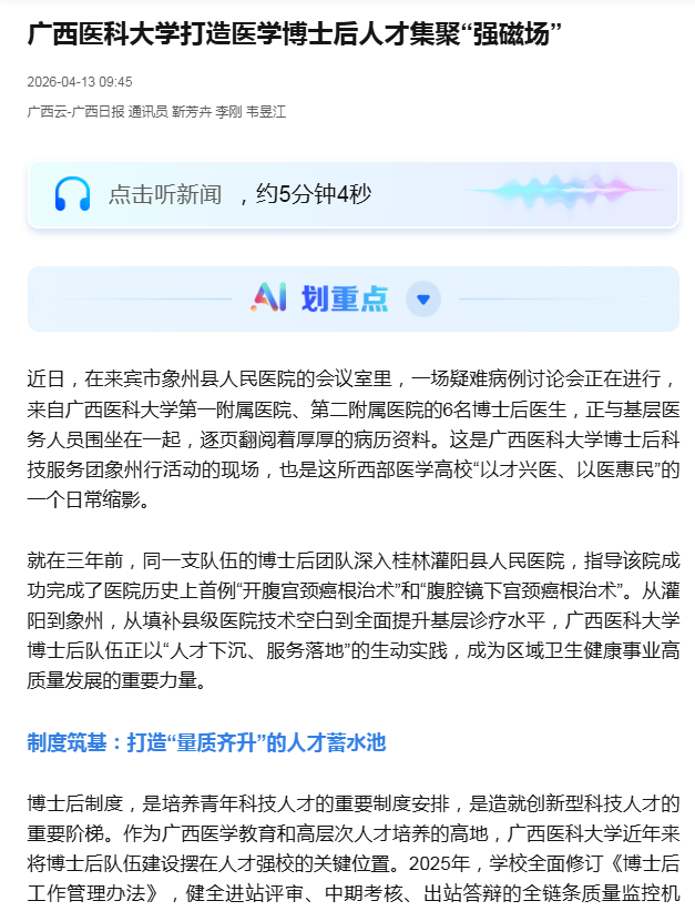 4月13日,广西日报-广西云客户端关注报道了taptap以制度筑基、全球引才、扎根八桂,推动博士后培养量质齐升、产才融合,打造医学博士后人才集聚“强磁场”,服务区域卫生健康事业的经验做法,阐释了学校以博士后工作为引擎,奋力书写医学高层次人才自主培养西部答卷的故事。