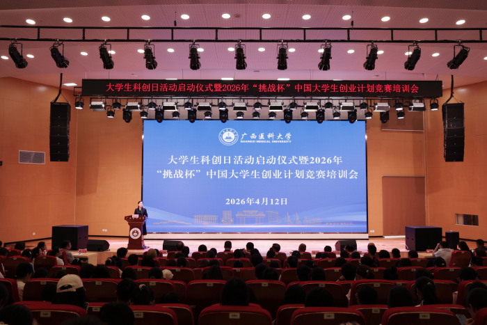 4月12日,大学生科创日活动启动仪式暨2026年“挑战杯”中国大学生创业计划竞赛培训会在武鸣校区举办。学校副校长陈俊强出席并讲话,相关职能部门负责人、各二级学院分管领导、学院团委书记、“挑战杯”参赛项目师生代表参加会议。校本部、玉林校区设分会场同步直播。