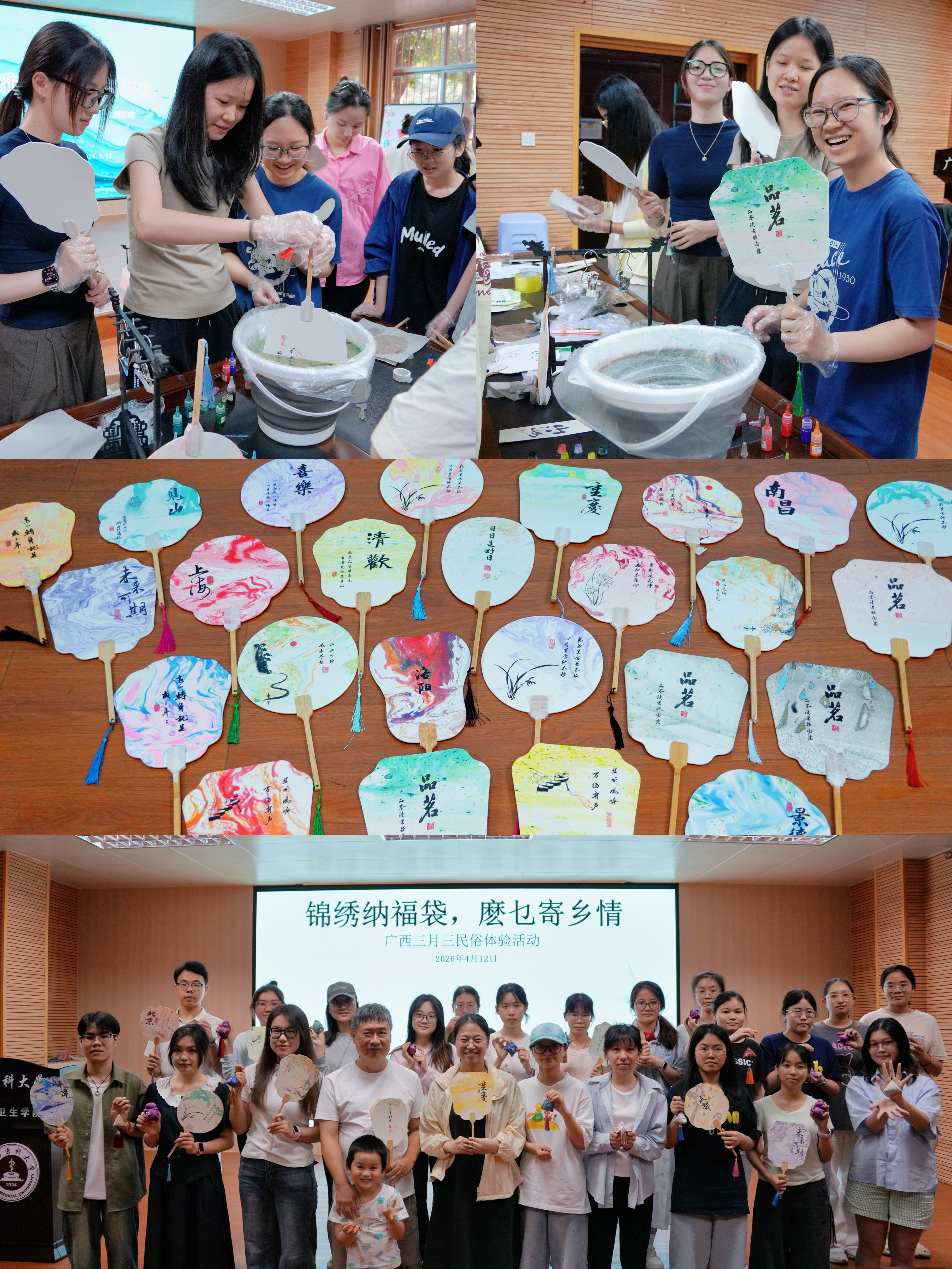 为传承中华优秀传统文化,铸牢中华民族共同体意识,2026年4月10日至13日,公共卫生学院于校本部及武鸣校区举办“广西三月三”系列民俗体验活动。活动紧扣“三月三壮韵牵情脉,筑民族同心向未来”主题,两校区联动开展多元体验,让民族团结之根深植青年心田。
