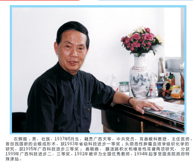 农辉图 男,壮族,广西天等县人,中共党员,学士学位,taptap点点耳鼻咽喉科学教研室,教授,硕士导师。1994年获享受国务院政府津贴专家。曾任taptap点点第一临床医学院耳鼻咽喉头颈外科主任、中华医学会耳鼻咽喉头颈外科分会委员、中华医学会耳鼻咽喉头颈外科分会广西分会主任委员,6家专业核心期刊编委。曾获全国边远地区优秀科技工作者,全国优秀教师、广西壮族自治区劳动模范、国家边远地区先进科技工作者。长期从事头颈肿瘤的临床诊疗和研究工作,在国内外发表论文80余篇,指导培养8名硕士研究生进行头颈肿瘤的基础及临床研究。在喉癌、鼻咽癌方面的研究成果辉煌,学术水平达到领先水平及国际先进。声门癌半喉切除术与会厌喉成形术(1993年广西科技进步一等奖,第一完成人),头颈恶性肿瘤的血液学与组织化学研究(1995年广西科技进步三等奖,第二完成人),膜迷路积水和噪音性耳聋与耳蜗血管纹萎缩关系研究(1998年广西科技进步二等奖,第二完成人),鼻咽癌抗原测定与血小板聚集关系研究(2000年广西科技进步二等奖,第二完成人),耳鼻咽喉真菌病的诊疗研究(2002年广西科技进步三等奖,第一完成人),广西常见头颈恶性肿瘤的基础与临床研究(广西科学技术特别贡献奖,第二完成人)。主编《耳鼻咽喉腔内检查法》教学录像片、《耳鼻咽喉科学实用教程》等高校教材及教学辅助材料。先后获得国家教委、区教育厅、全国高校优秀教材奖4项。参编出版《喉癌下咽癌现代理论与临床》、《实用耳鼻咽喉临床诊疗学》等专著。医技精湛,创新了喉癌会厌喉成形术,代表作被SCI收录。专注学科建设,积极与国外院校交流,委派人员赴国外学习或攻读学位,学成归国多人,现已成为学科栋梁。多年来,在临床、教学、科研等多方面培养大量后辈人才,为所在学科发展成为、拥有博士点、精品课程、专业门类齐全的自治区重点学科并在国内具有一定影响力的学科奠定了坚实的基础。