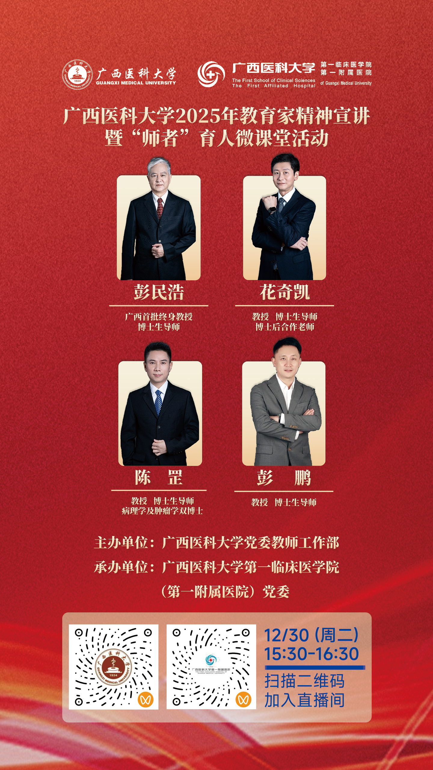 本期活动主题为“育人心语 医路传承”,特邀第一临床医学院、第一附属医院彭民浩教授、花奇凯教授、陈罡教授、彭鹏教授,通过现场访谈形式分享从医、从教、育人心得,与现场师生共话育人使命,传递立德树人的担当,彰显“为师为学为人”的榜样力量。