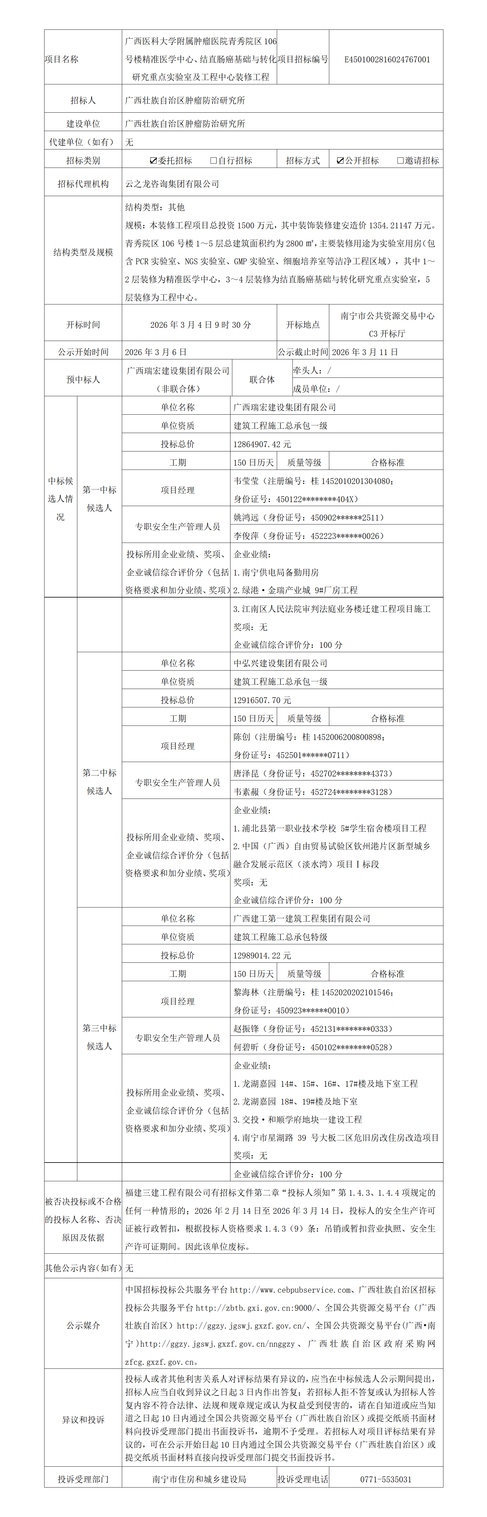 taptap点点附属肿瘤医院青秀院区106号楼精准医学中心、结直肠癌基础与转化研究重点实验室及工程中心装修工程中标候选人公示