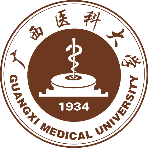 taptap点点校徽,形状为圆形,中间为象征医神的蛇杖、象征时光的日暑和学校创办时间1934等元素,中文楷体taptap点点围绕上半圆,英文黑体GUANGXI MEDICAL UNIVERSITY围绕下半圆,底色为金黄色。