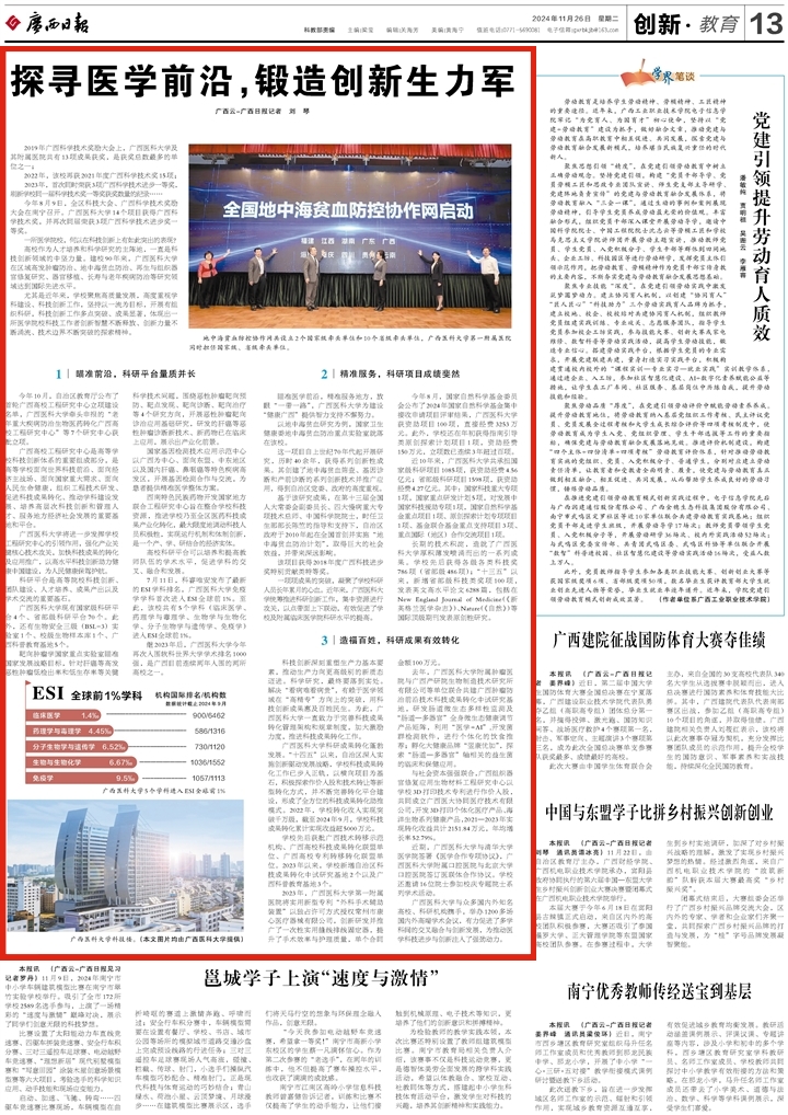 2024年11月26日,《广西日报》在第013版创新·教育专栏刊发题为《探寻医学前沿,锻造创新生力军》的文章,展现taptap点点聚焦高质量发展,高度重视学科建设、科技创新工作,坚持以一流为目标,开展有组织科研,科技创新工作多点突破、成果显著的工作成果。
