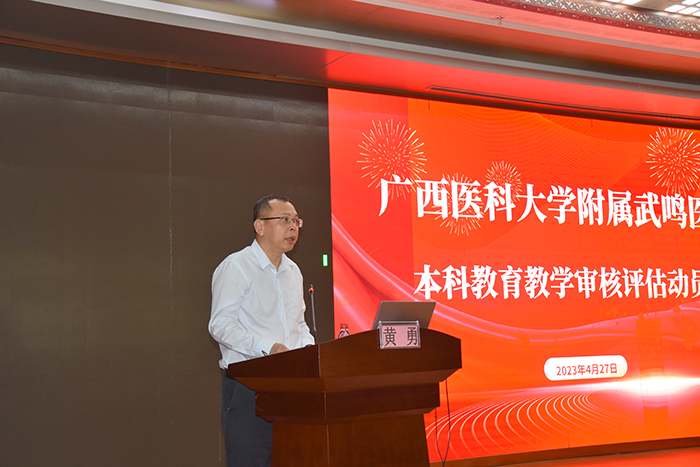 为做好新一轮本科教育教学审核评估工作,4月27日下午,附属武鸣医院在1号楼21楼学术厅召开本科教育教学审核评估动员会。全体院领导、中层干部、第二届教学督导组专家、全体教研室、科室主任及副主任、教学秘书、教师代表及学生代表参加了会议。会议由陈茂伟副院长主持。
