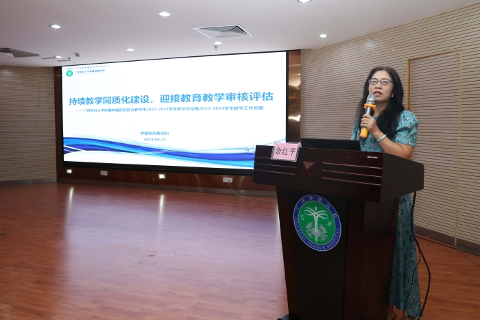 余红平副院长首先对附属肿瘤医院前期开展本科教育教学审核评估准备工作进行总结,通报了存在问题,并布置下一步工作计划安排。要求各教研室、临床科室按照评估要求,认真开展自查,切实提高教学质量、规范教学管理,确保高标准、高质量地完成审核评估的前期准备工作。
