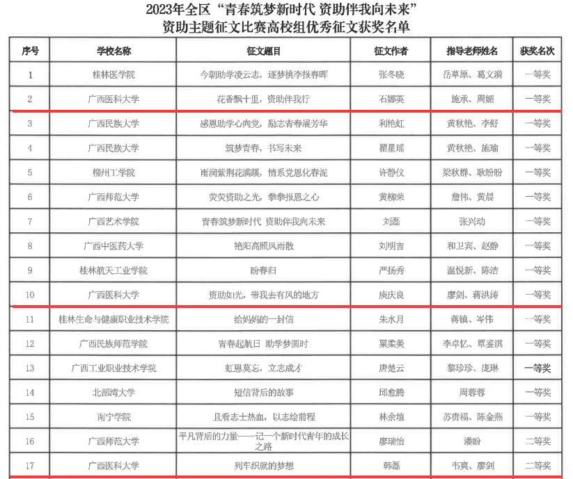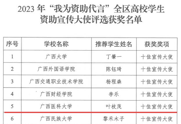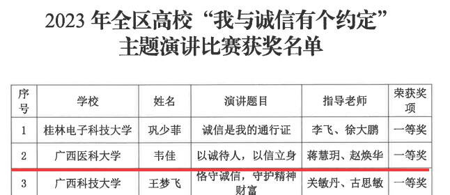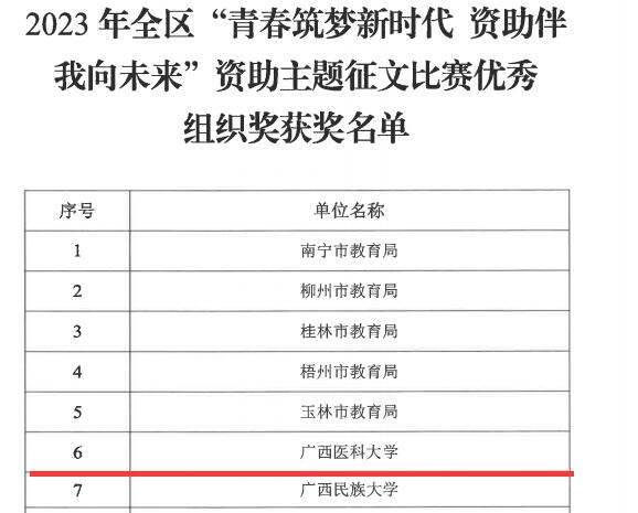 近日,自治区教育厅公布了2023年全区高校“青春筑梦新时代 资助伴我向未来”资助主题征文比赛、“我与诚信有个约定”主题演讲比赛、“我为资助代言”学生资助宣传大使评选等系列主题比赛的评选结果,taptap获得数项集体及个人荣誉。其中,taptap获得全区“青春筑梦新时代 资助伴我向未来”资助主题征文比赛优秀组织奖,药学院学生石娜英、第一临床医学院学生庾庆良均获得征文比赛一等奖,口腔医学院学生韩磊获得征文比赛二等奖。在演讲比赛中,taptap护理学院学生韦佳从初赛、半决赛一路晋级,最终在决赛获得一等奖的好成绩。在学生资助大使评选活动中,口腔医学院的叶枝茂同学荣获“十佳宣传大使”称号。在以上活动中,施承、周媚、廖剑、蒋洪涛、蒋慧月、赵焕华、韦爽等七位老师获评优秀指导教师。