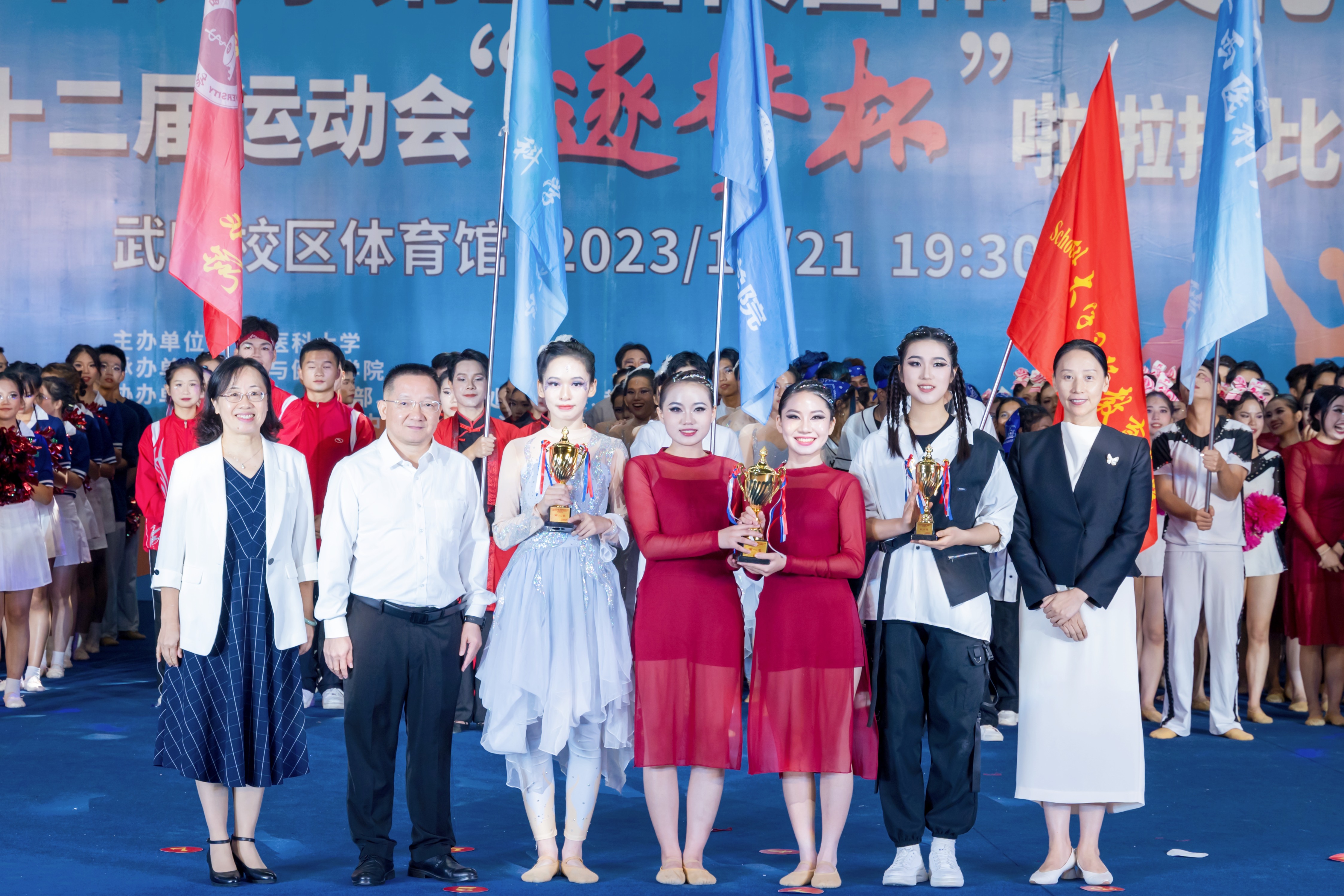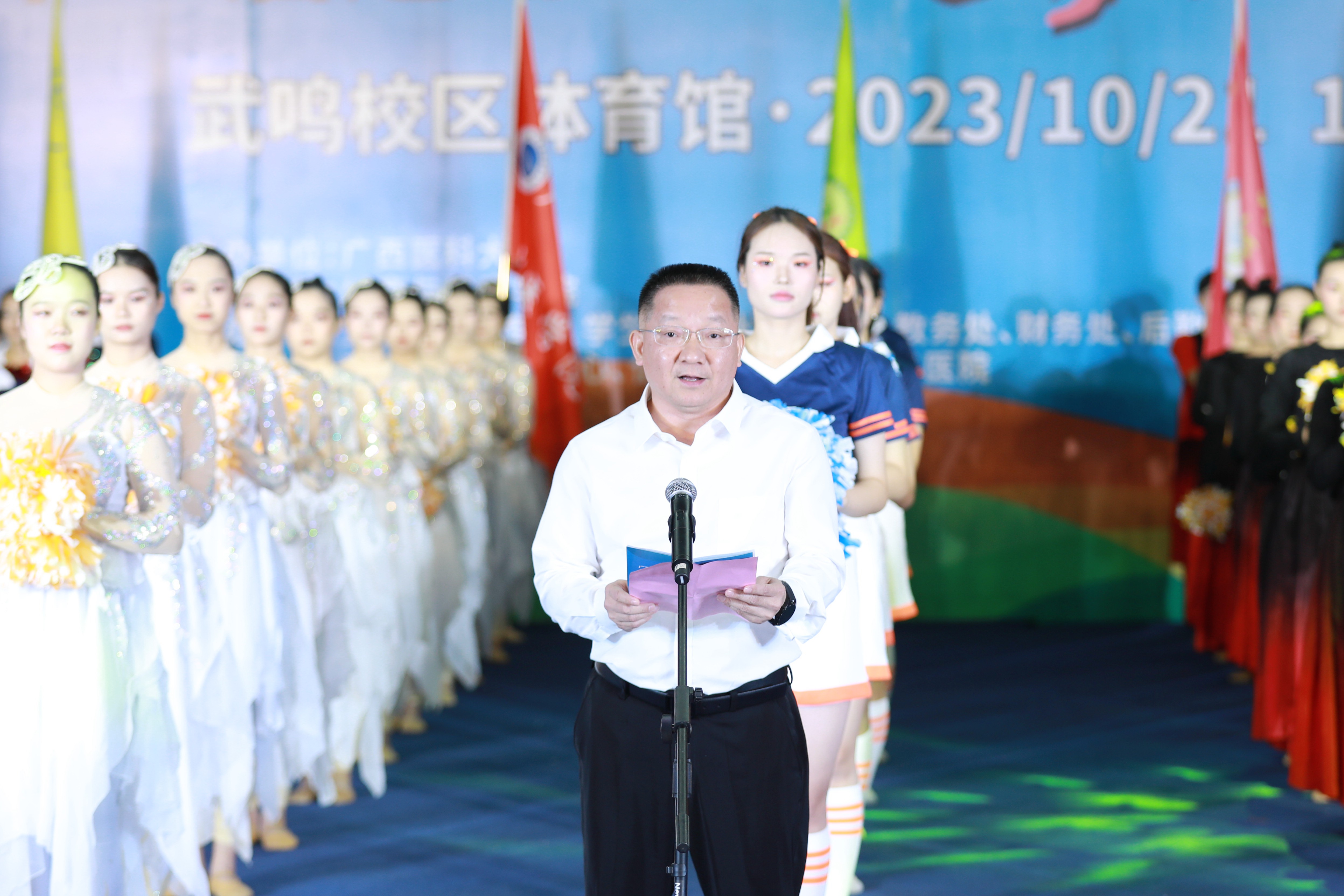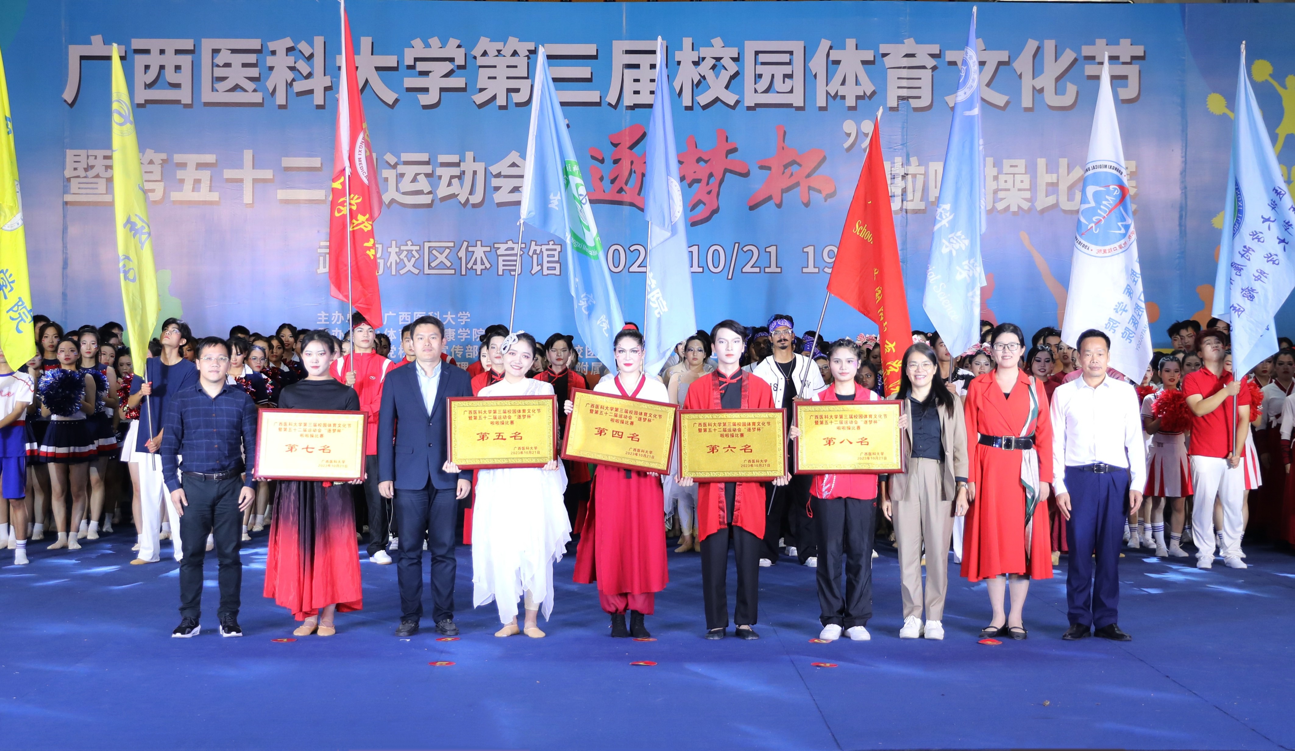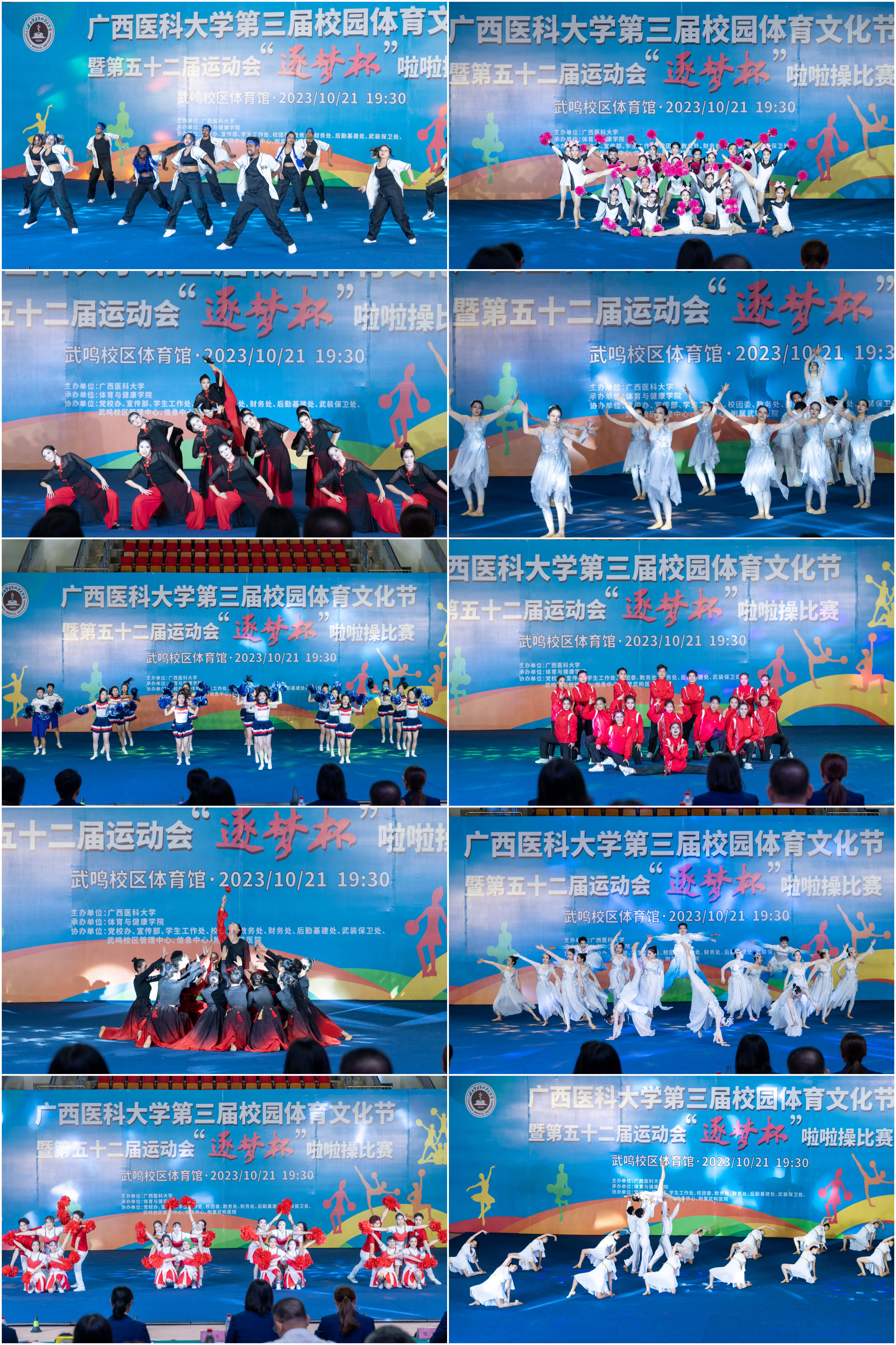 金九银十,骆越古城,秋高气爽,丹桂飘香。乘着第19届杭州亚运会东风,第一届全国学生(青年)运动会准备在我区开幕之际,taptap点点第三届校园体育文化节暨第五十二届运动会“逐梦杯”啦啦操比赛,于10月21日晚19:30在武鸣校区体育馆成功举办。本次啦啦操比赛由taptap点点主办、体育与健康学院承办。卢德成副校长、学校职能部处室、二级学院领导和老师观看比赛。