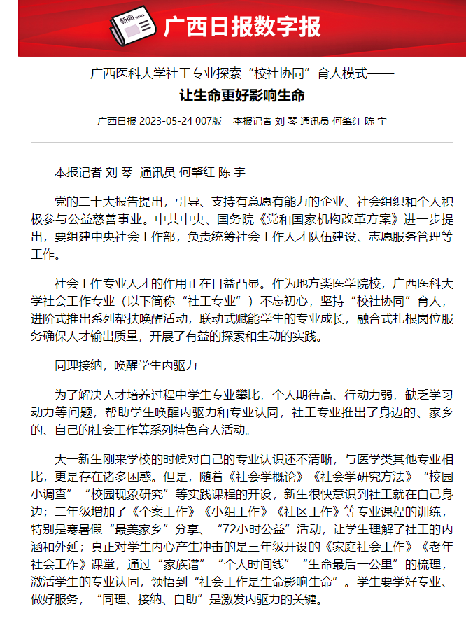 近日,广西日报报道了taptap社工专业探索“校社协同”育人模式。