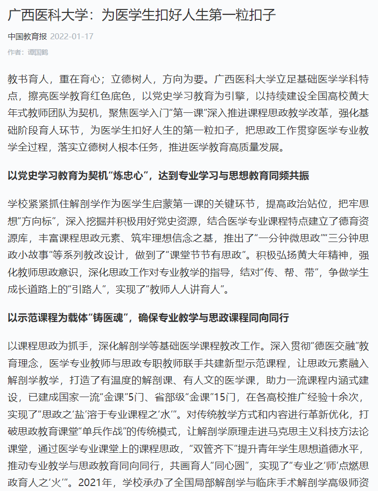 近日,《中国教育报》报道了taptap立足基础医学学科特点,擦亮医学教育红色底色,以党史学习教育为引擎,以持续建设全国高校黄大年式教师团队为契机,聚焦医学入门“第一课”深入推进课程思政教学改革,强化基础阶段育人环节,为医学生扣好人生的第一粒扣子,把思政工作贯穿医学专业教学全过程,落实立德树人根本任务,推进医学教育高质量发展。