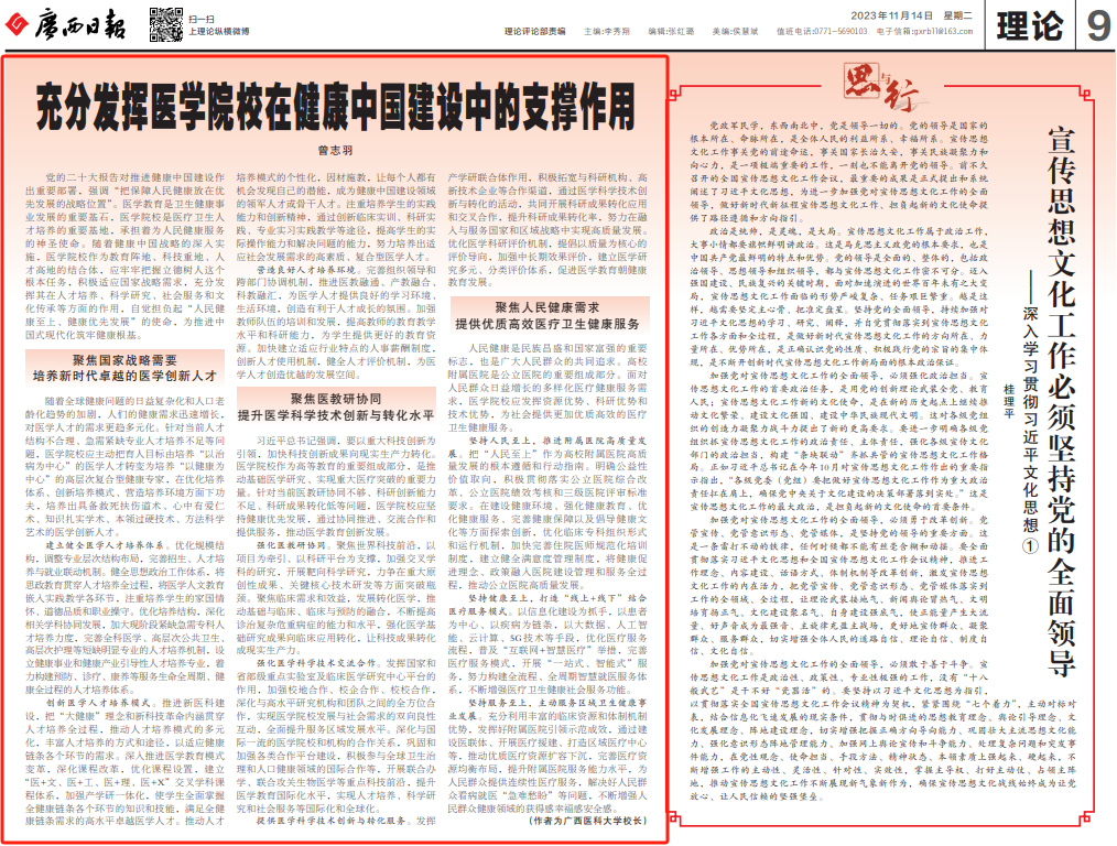 2023年11月14日,广西日报刊发校长曾志羽理论文章:充分发挥医学院校在健康中国建设中的支撑作用。