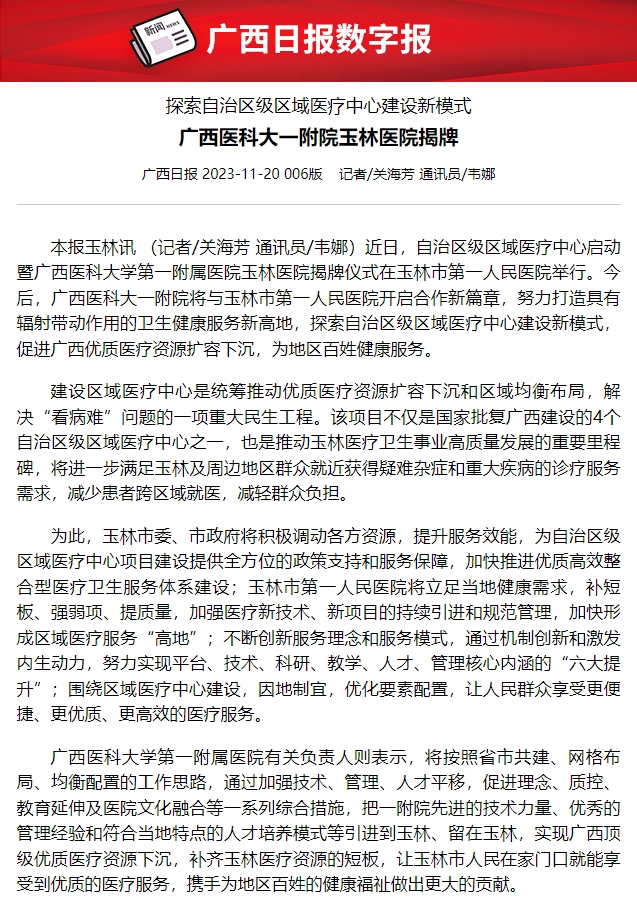 2023年11月20日,广西日报刊发新闻报道:探索自治区级区域医疗中心建设新模式 广西医科大一附院玉林医院揭牌